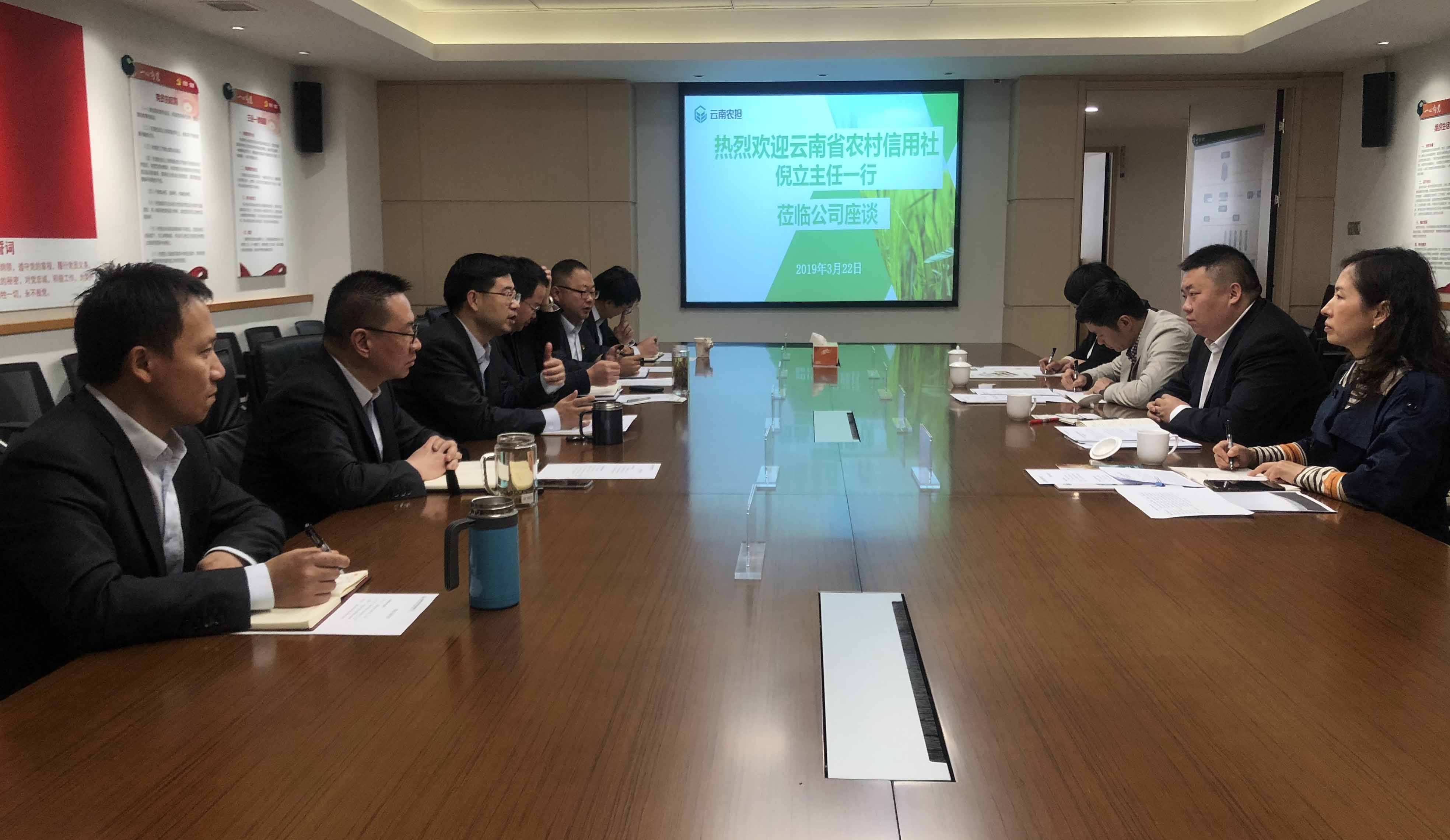 3月22日,云南省農(nóng)村信用社聯(lián)合社主任倪立率業(yè)務(wù)發(fā)展部、信貸管理部、昆明市農(nóng)信社到云南農(nóng)擔(dān)公司座談,公司郭影董事長(zhǎng)、杜開波總經(jīng)理、廖寅皓副總經(jīng)理及風(fēng)控、業(yè)務(wù)、機(jī)構(gòu)等部門參加會(huì)議。會(huì)上,雙方就銀擔(dān)合作情況進(jìn)行全面交流總結(jié),并對(duì)下一步深化合作達(dá)成一致意見。