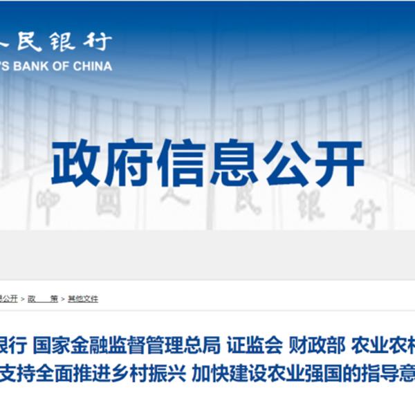 中國人民銀行、金融監(jiān)管總局、中國證監(jiān)會、財政部、農(nóng)業(yè)農(nóng)村部近日聯(lián)合發(fā)布《關(guān)于金融支持全面推進鄉(xiāng)村振興 加快建設(shè)農(nóng)業(yè)強國的指導(dǎo)意見》。