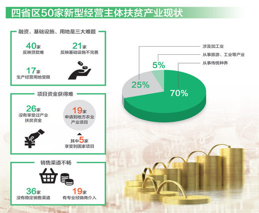 據(jù)調(diào)查,受訪的50家新型經(jīng)營主體中,80%的主體反映“差錢”。資金難是扶貧產(chǎn)業(yè)發(fā)展的主要瓶頸。