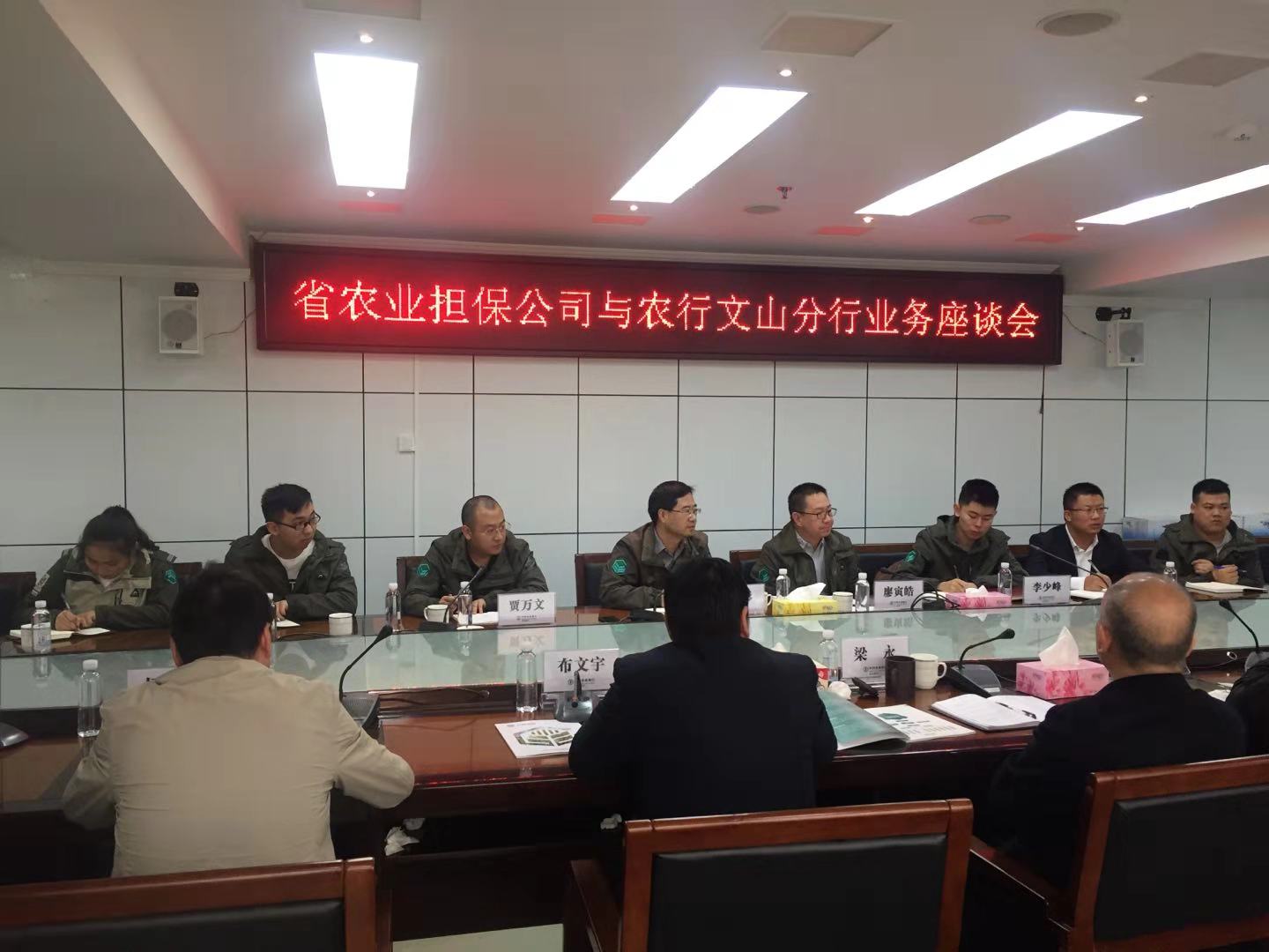 2018年11月27日,省農(nóng)擔(dān)公司董事長郭影、副總經(jīng)理廖寅皓、農(nóng)擔(dān)二部副總經(jīng)理賈萬文以及辦事處負(fù)責(zé)人李少峰帶領(lǐng)文山、硯山辦事處人員前往農(nóng)業(yè)銀行文山州分行參加座談。出席座談的有農(nóng)行州分行梁永行長、布文宇副行長以及各分管部門領(lǐng)導(dǎo)。