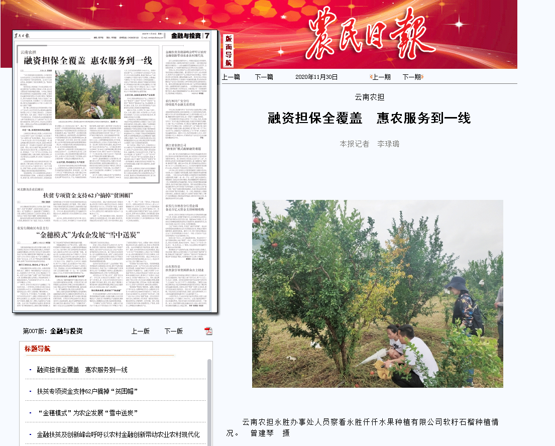 10月,國(guó)家農(nóng)擔(dān)公司微信公眾號(hào)“農(nóng)擔(dān)經(jīng)驗(yàn)談”專(zhuān)欄中對(duì)云南農(nóng)擔(dān)公司認(rèn)真貫徹落實(shí)云南省脫貧攻堅(jiān)等扶貧政策,支持麗江永勝縣農(nóng)業(yè)生產(chǎn)、帶動(dòng)貧困戶(hù)脫貧增收,積極為當(dāng)?shù)匦滦娃r(nóng)業(yè)經(jīng)營(yíng)主體提供融資擔(dān)保服務(wù)進(jìn)行了宣傳。《農(nóng)民日?qǐng)?bào)》從國(guó)家農(nóng)擔(dān)公司了解到云南農(nóng)擔(dān)支農(nóng)惠農(nóng)的相關(guān)情況后,11月30日以《融資擔(dān)保全覆蓋 惠農(nóng)服務(wù)到一線(xiàn)》為題報(bào)道了云南農(nóng)擔(dān)公司成立以來(lái),不斷完善分支機(jī)構(gòu)布局,實(shí)現(xiàn)了機(jī)構(gòu)、業(yè)務(wù)和人員的全面下沉,形成了覆蓋全省的農(nóng)擔(dān)基層服務(wù)網(wǎng)絡(luò)體系,以點(diǎn)帶面、立足當(dāng)?shù)兀瑸橥苿?dòng)縣域經(jīng)濟(jì)和云南高原特色農(nóng)業(yè)產(chǎn)業(yè)發(fā)展、推進(jìn)農(nóng)業(yè)供給側(cè)結(jié)構(gòu)性改革、助力脫貧攻堅(jiān)、助推“鄉(xiāng)村振興”戰(zhàn)略實(shí)施發(fā)揮了積極作用。