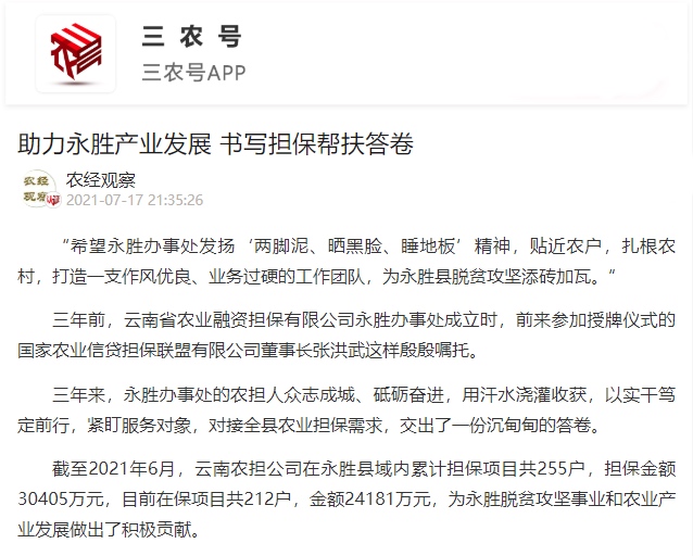 云南農(nóng)擔(dān)永勝辦事處自2019年8月22日成立,充分彰顯了云南農(nóng)擔(dān)服務(wù)網(wǎng)絡(luò)擴面下沉的深度和力度,也體現(xiàn)了國家農(nóng)擔(dān)對云南省鄉(xiāng)村振興戰(zhàn)略實施的大力支持。2021年7月17日,《農(nóng)民日報》三農(nóng)號以“助力永勝產(chǎn)業(yè)發(fā)展 書寫擔(dān)保幫扶答卷”為題對云南農(nóng)擔(dān)永勝辦事處進行了專題報道。以下是詳細內(nèi)容: