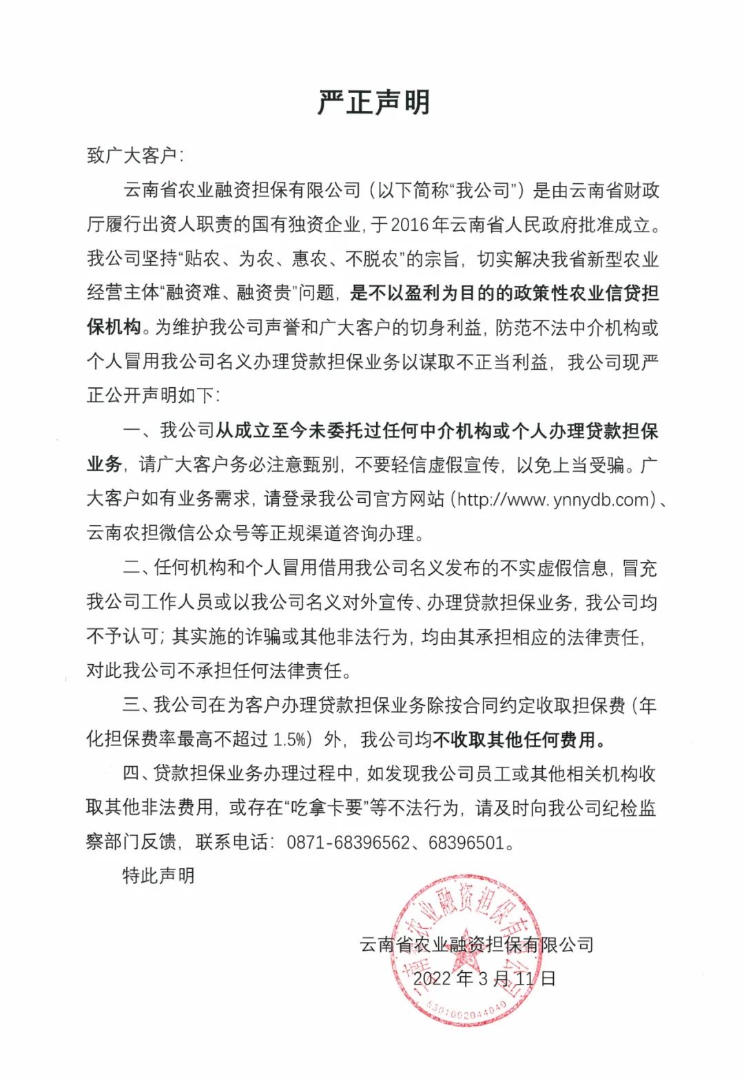 云南省農(nóng)業(yè)融資擔(dān)保有限公司嚴正聲明